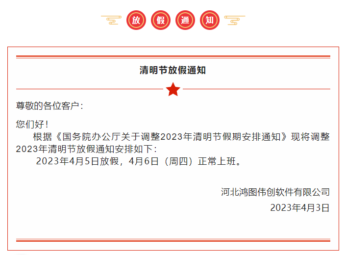 2023年河北鴻圖偉創(chuàng)-用友軟件清明放假及值班安排