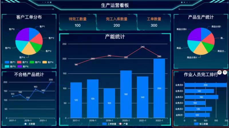 生產(chǎn)看板支持趨勢(shì)圖、餅圖、指標(biāo)卡、排行榜等多種可視化數(shù)據(jù)展示樣式,也預(yù)置了多套精美皮膚供選擇,自定義的看板可發(fā)布為菜單,單獨(dú)授權(quán)給老板、廠長(zhǎng)、車間、庫(kù)管、品控等多用戶角色使用, 看板支持在大屏、電腦端、工控機(jī)、車間電視等多端展示。