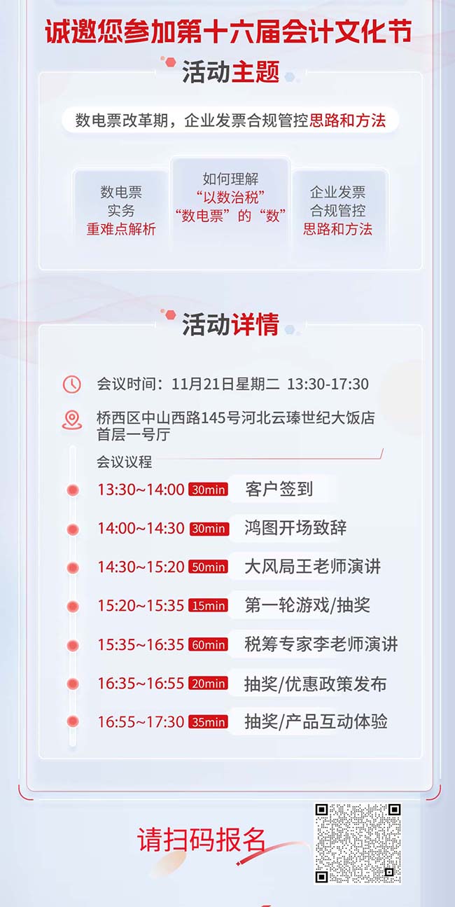 隨著全電發(fā)票的試點(diǎn)工作不斷推進(jìn),全電發(fā)票時(shí)代即將到來!為了幫助大家更好地迎接 數(shù)電發(fā)票-“以數(shù)治稅”新時(shí)代的到來,了解更多數(shù)電票注意事項(xiàng)。我們特別邀請(qǐng)您參加這場(chǎng)重要的會(huì)議。