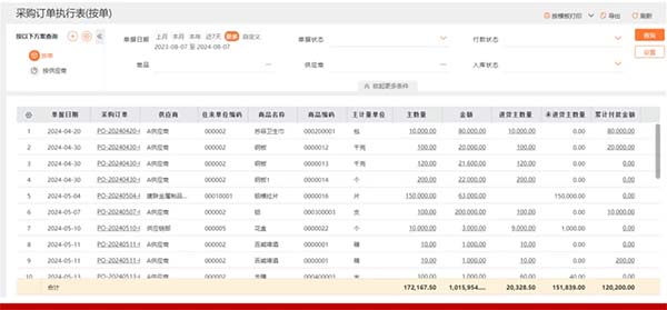 根據(jù)跟供應商的采購合同,一次性或者分批進貨入庫,實時查看訂了多少貨-入庫了多少貨-票收了多少-錢付了多少,還有多少貨、錢、票是未執(zhí)行的,是否入庫?是否收票?合同金額?已付金額、未付金額到底是多少?