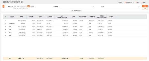 通過(guò)后臺(tái)可以清楚地知道交易次數(shù)、銷(xiāo)售金額、無(wú)稅金額、成本金額、毛利潤(rùn)、凈利潤(rùn)等,一張圖就能清晰知道每個(gè)客戶(hù)給公司帶來(lái)了多少毛利、多少凈利。