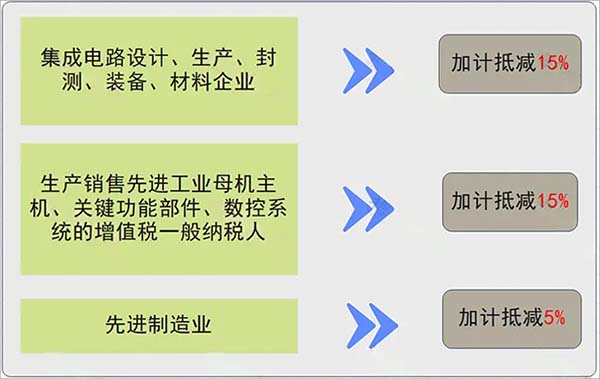 政策要點:對集成電路企業(yè)、工業(yè)母機(jī)企業(yè)、先進(jìn)制造業(yè)企業(yè)等實施增值稅加計抵減政策。