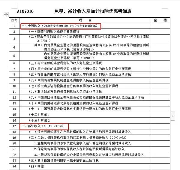 如有免稅收入和減計收入,務必認真填寫A107010《免稅、減計收入及加計扣除優(yōu)惠明細表》以及附表。