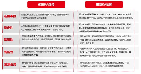 結合BIP商業(yè)網絡平臺自有的技術底座支持,運用RPA、OCR、GPT等先進數(shù)智化能力,為品牌商提供KA經營管理解決方案產品。業(yè)界以往針對此類業(yè)務通常會采用爬蟲技術手段進行相關的數(shù)據(jù)鏈接處理,但是其技術手段存在不穩(wěn)定,資源消耗高、特殊場景無法識別、KA的供應商系統(tǒng)平臺防爬等障礙問題,相比傳統(tǒng)爬蟲技術手段,用友KA經營協(xié)同管理產品具備更先進、更穩(wěn)定、更智能、資源消耗低、應對更加復雜的系統(tǒng)場景等優(yōu)勢特點。