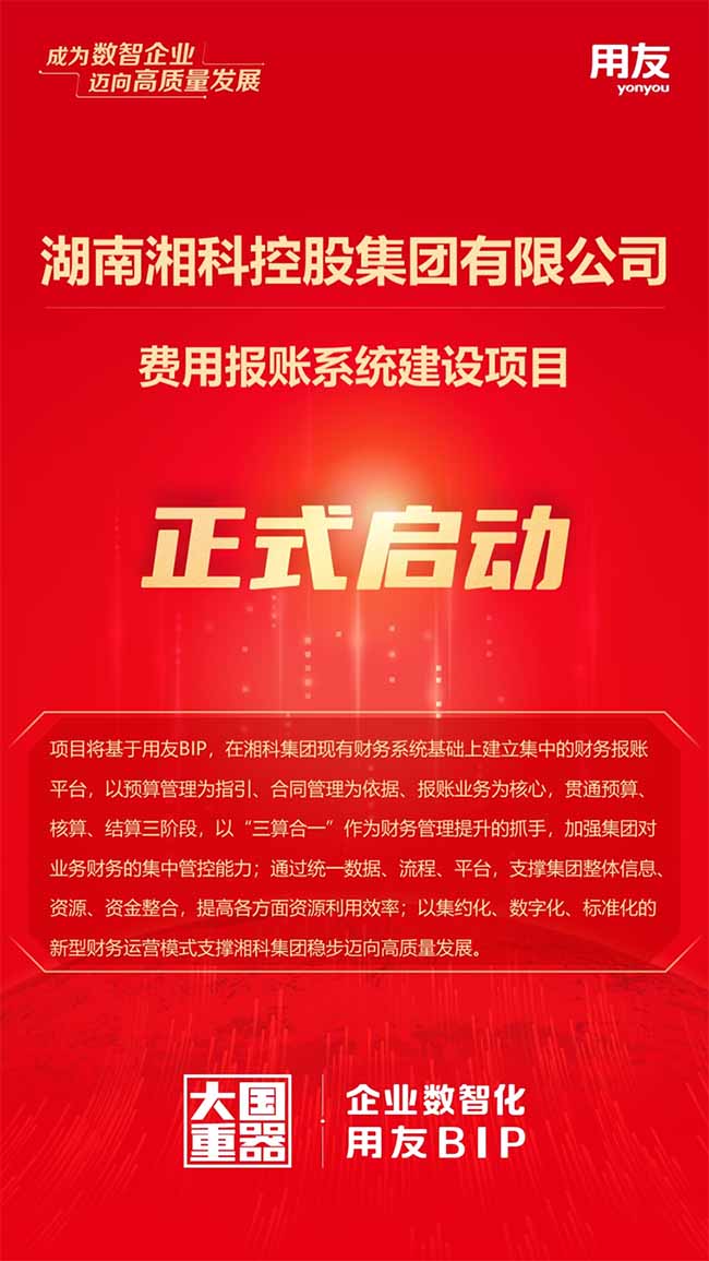 近日,由用友承建的湖南湘科控股集團有限公司(以下簡稱“湘科集團”)費用報賬系統(tǒng)建設項目正式啟動。湘科集團黨委委員、總會計師兼資管公司黨委書記、執(zhí)行董事劉祖明,黨委委員、副總經(jīng)理董金龍,財務管理部部長兼項目經(jīng)理余麗芝及用友相關負責人出席啟動儀式。