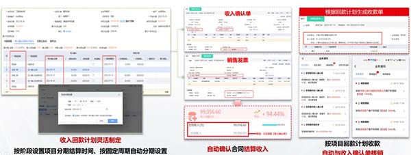智能核算應(yīng)收款:按項目階段設(shè)置項目分期結(jié)算時間、自動分期設(shè)置,自動確認合同結(jié)算收入,自動與收入確認單核銷;