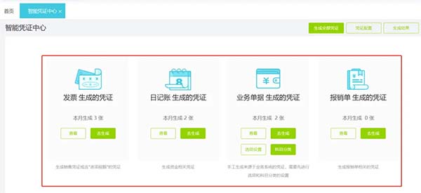 在發(fā)票管理模塊中,用戶可以直接從“稅務(wù)數(shù)字賬戶”中提取公司收到的普票和專票,并匯總同類型的發(fā)票,一鍵自動生成憑證,完成做賬;