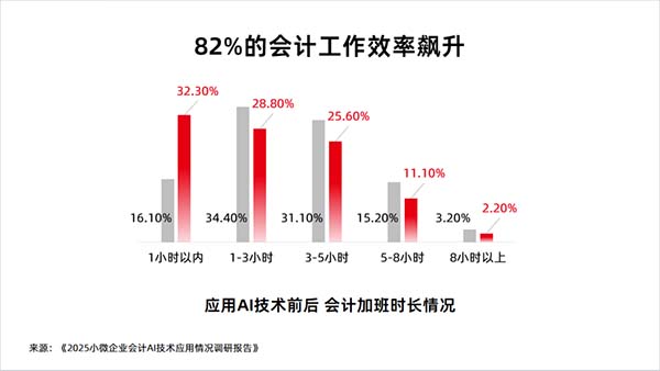 AI技術(shù)的應(yīng)用讓小微企業(yè)會計的工作效率得到了質(zhì)的飛躍。調(diào)研數(shù)據(jù)顯示,使用AI技術(shù)后,82%的會計人員表示工作時間明顯縮短,加班時長也大幅減少。