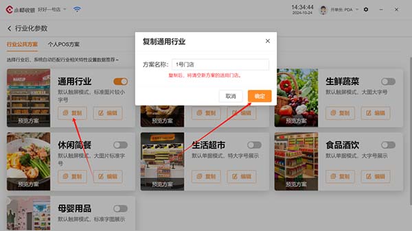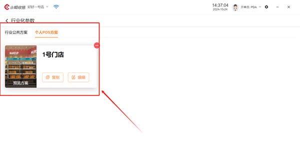 去每個門店P(guān)OS小暢收銀的在參數(shù)設(shè)置里,創(chuàng)建新的個人POS方案(個人POS方案不能直接新增,需要用行業(yè)公共方案復(fù)制成新的個人POS方案)