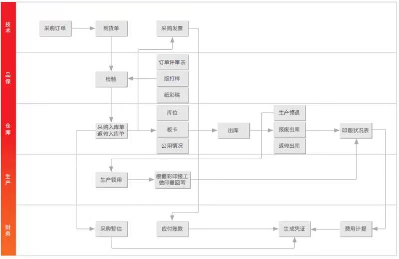 • 開發(fā)印版管理,將印版采購、驗收入庫、掛賬、開票付款、印版返修、印版用量等業(yè)務統(tǒng)一起來,并實現(xiàn)印版日報,費用計提,讓印版