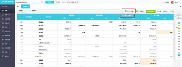 通常進(jìn)入軟件的余額表中查看當(dāng)月的余額表時,只顯示【本期發(fā)生額】,然后有時候我們也需要將本年累計也顯示出來,因此易代賬軟件中設(shè)置了可以自由設(shè)置是否顯示。