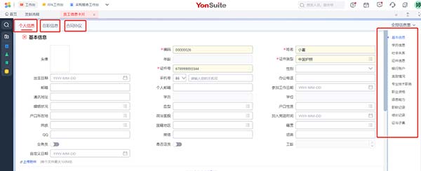 Step2:進行員工信息錄入,存在多個信息集,可根據(jù)需要填寫,其中個人信息-基本信息中員工編碼、員工姓名、證件類型、證件號、手機號和郵箱(可填其一)、任職信息需要維護;