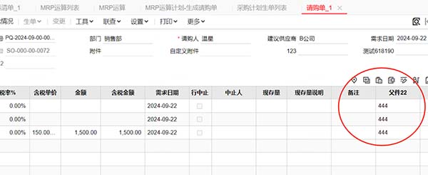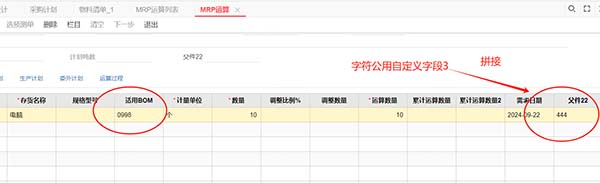 2、檢查拼接(MRP運算單、采購計劃、請購單、采購訂單)明細,(字符公用自定義項3名稱(父件22));